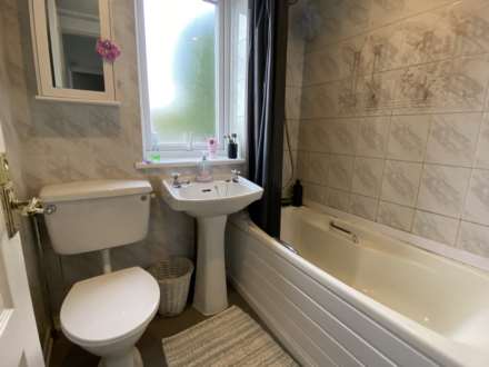Three piece suite, shower mixer taps, fully tiled walls, central heating radiator and double glazed window to the rear.